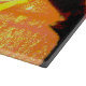 Das abstrakte Kunstwerk auf diesem 15"x11" Schneidebrett entstand aus einem Originalfoto von HomeWare aus Regentropfen auf einer Pflanze aus Korallenpalmen. Das Foto ist in sonnigen tropischen Farbtönen gehalten, hellgelb, rosa, orange, terracotta, blau und weiß.