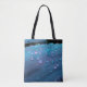 Das Kunstwerk von ZoeSPEAK auf diesem Tote Bag ist ein originales Nahaufnahmen von Regentropfen auf einer Manilla Palmfront. Die blau getönte Fronde ist gebogen, was uns einen Blick auf die weitläufigen blauen Wassertropfen von verschiedenen Winkeln gibt. Oben in der Kurve sehen wir einen Horizont von Regentropfen vor dunklem Hintergrund. Während sich die Frondkurve dreht, haben die Tröpfchen helle Highlights und werden im Schatten gegenüber der Unterseite kleiner.