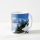 Die Tasse des Kaffees wird mit einem Foto des wunderschönen und berühmten Berges Rainier im Staat von Washington gezeigt.