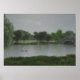 Cette affiche présente une oeuvre originale d'une scène grise et pluvieuse au bord du lac créée en Vue d'Esprit par l'artiste Jayne Wilson. Une famille de canards traverse le lac à mesure que les gouttes de pluie tombent. Un pont en pierre mène à un chalet situé à l'extrémité du lac.