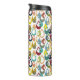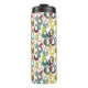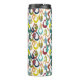 Diese Wärmflasche hat ein modernes Design von Regentropfen mit Löchern in Retrofarben wiederholt sich über das Design auf einem Feld von weiß.