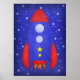 Ein blaues und rotes Raketenschiff stürzt durch den Raum, in diesem jungen Weltraum Liebhaber Design!