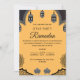 Diese Ramadan-Iftar-Einladung zeigt einen reichhaltigen goldenen Hintergrund, der von traditionellen islamischen Mustern und hängenden Laternenillustrationen eingerahmt wird. Das klassische Layout und die warmen Töne schaffen eine einladende Atmosphäre, die den Geist der Zusammengehörigkeit, der Segnungen und der gemeinsamen Momente während des heiligen Monats widerspiegelt.
