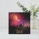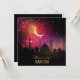Silhouette für Ramadan mit einer Moschee auf einem Halbmond mit einem rosa und orangefarbenen Sonnenuntergang und Sternen.