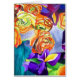 Ein originelles Aquarellbild mit bunten Gelb- und Orangenranunkulus Frühlingsblumen und lila Iris-Blume. Dieses farbenfrohe und lebhafte Blumendesign stammt aus einem originellen Gemälde. Das originelle und wunderschöne, orange und lila botanische Design würde jede Umgebung beleben.