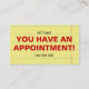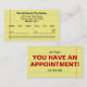 Une carte de rappel de rendez-vous facile à remplir pour le bureau de votre médecin ou dentiste. Circulez le jour de la semaine, puis remplissez la date et l'heure et encerclez AM ou PM. Petit texte, "Cette fois est réservée exclusivement à vous. Si vous ne pouvez pas conserver ce rendez-vous, veuillez donner un préavis de 24 heures, sinon vous serez facturé personnellement pour la période réservée." Immense texte rouge à l'arrière, "VOUS AVEZ UNE NOMINATION !" Tout le texte peut être modifié et personnalisé pour votre entreprise.