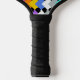 Cette pagaie à pickleball a une conception géométrique de diamants néons se chevauchant sur un terrain de noir.