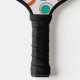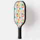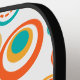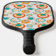 Cette pagaie à pickleball a un design moderne du milieu du siècle de cercles concentriques en or, orange et turquoise sur un arrière - plan blanc.