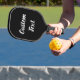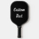 Cette pagaie de pickleball noir a un texte d'affichage dans un script blanc. Le texte peut être modifié ou supprimé.
