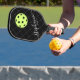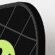Paddle personnalisé unique, mignon, élégant et amusant imprimé personnalisé avec un motif arrière - plan net noir et blanc et lumineux neon jaune pickleball conception icône avec votre nom dans un élégant script de calligraphie moderne écriture manuscrite cursive police et numéro de téléphone ou informations de contact en petit texte.