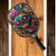 Une pagaie au design coloré, prête pour une partie de pickleball. Les couleurs vives ajoutent une touche ludique et artistique à la pagaie traditionnelle.
