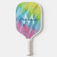 Pagaie de Pickleball Monogrammé Personnalisée avec teinture à cravate rose, turquoise, verte et jaune motif et écriture manuscrite décontractée police de calligraphie.