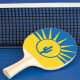 Ping pong paddle avec drapeau de la ville Mesa, Arizona; drapeau jaune et bleu avec illustrations stylisées du désert, cactus et soleil levant