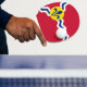 Pagaie de ping pong avec drapeau de la ville de Saint-Louis; drapeau rouge avec vagues blanches et bleues et fleur de lys bleu en cercle jaune