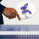 Bijoux, bleu, saphir, papillon aux fleurs pétillantes avec aile décorée de bleu, fleurs précieuses avec feuilles d'or sur arrière - plan blanc.