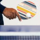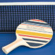 Il s'agit d'une pagaie de ping-pong personnalisable à rayures beige, bleue, rouge et jaune.