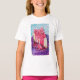 A slice of cake topped with vibrant red raspberries drips with rich sauce onto a dark purple plate. The background features a blue lattice pattern, complementing the dessert's vivid colors.