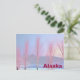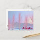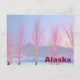 Digitales Bild von schneebedeckten Birkenbäumen; der Schnee gefärbt von der untergehenden Sonne. Es erscheint auch das Textlesen "Alaska". Hier im Norden ist es üblich, schneebedeckte Bäume zu sehen, die von der Sonne am Horizont tief in Rosa oder Orange eingefärbt sind.