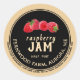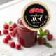 Stilisierte rote Himbeeren auf schwarz mit Kraftrahmen; Datum und Zutaten