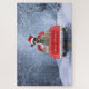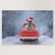 Ein Weihnachtswagen, der durch den Schnee fährt und Weihnachtsgeschenke und Rat Terrier Hund liefert. Eine perfekte Weihnachtsgeschenkidee für jemanden, der diesen Hund züchtet.