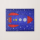 Ein blaues und rotes Raketenschiff stürzt durch den Raum, in diesem jungen Weltraum Liebhaber Design!