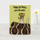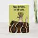 Ein ruheloser Cartoon, der vom Schlafen gestört wird, zieht eine Zunge und Zähne aus, während er sich von seinen Fingern erhebt. Schwanz rasselt, Augen pichelend und flesenhaft Textur mit Schuppen und Haut, die schlängelartig. "Herzlichen Glückwunsch zum Geburtstag, du alte Schlange."