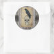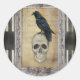 Ein dunkelgotisches Halbbild mit einem Schädel, ein schöner Rabe, in einem Vintagen Rahmen auf einem Hintergrund aus schwarz-weißen Streifen mit einer Grunge-Textur platziert. © WickwiederholtLovely