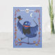Ein preußisch-blauer Federschwarz ist formell in einer satinierten Weste, orangefarbener Bugs-Krawatte, Tophut und Stock gekleidet, während er auf einem Baumarm unter dem weißen Halbmond tanzt.