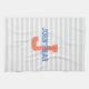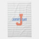 Serviette rayée grise et blanche de barre comportant un grand monogramme de lettre de l'orange une, au milieu, et texte bleu prêt à personnaliser.