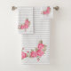 Simple et mignon, ces l'ensemble blanc et gris de rose de bourgeon mignon de rose de rayures de motif de serviette est la manière parfaite d'ajouter un certains style et talent supplémentaires à votre salle de bains. Les caractéristiques grises et le blanc barre l'arrière - plan avec les roses roses et les bourgeons roses.