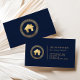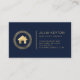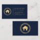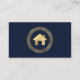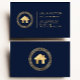 Diese echte Anwesen-Visitenkarte enthält ein goldenes Imitat-Hauslogo, gerahmt durch ein kreisförmiges griechisches Schlüsselmotiv auf dem links und schlichten, goldfarbenen Sans Serif-Text auf der rechten Seite, mit einer vertikalen Linie zwischen, auf einem marineblauen Hintergrund. Eine größere Version des Hauslogos erscheint auf der Rückseite.
