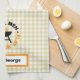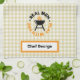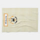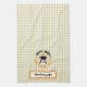 This masculine towel features a barbecue grill and says "Real Men Play With Fire" going around the grill. Text is in black and orange. Background is a light tan gingham check print. At the bottom there is a template provided for you to personalize it with your name. There is a coordinating oven mitt, pot holder and apron in the shop, as well as another matching towel.
