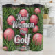 Diese Grafik zeigt ein gewagtes, zweifarbiges Design mit dem Text "Real Women Play Golf", der ein stilisiertes Muster von Golfbällen im Gras überlagert. Das Design ist einfach, klar und macht eine starke, lustige Aussage.