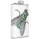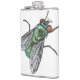 Detailed realistic illustration of a vibrant green bottle fly with shiny iridescent green body, large red compound eyes, delicate transparent wings and fine black details.