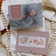 Simple faire-part de naissance moderne dispose d'une seule photo horizontale à fond saigné ou à orientation paysage avec une bannière rose à feuille d'or en haut à gauche, portant le nom du bébé, la date de naissance et les statistiques de naissance. Ajoutez un message personnel à l'arrière, ainsi que trois photos carrés supplémentaires.
