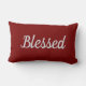 Lumbar Throw oreiller est montré avec un plaid sur mesure avec le mot "Béni" en blanc sur le haut gauche du coussin. Couleurs Plaid : Pêche, oranges-Citrouilles, Blanc, gris argenté et Bourgogne, l'envers est solide Bourgogne avec un grand gris argenté "béni" au centre. Customisez ce coussin ou achetez tel quel.