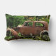 Ce coussin lombaire comporte un tacot pauvre de junker laissé à la rouille dans les bois. Il est entouré par les arbres verts et les fleurs sauvages blancs. Il y a une certaines beauté et dignité à cette vieille voiture orange, brune et bleue rouillée.