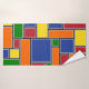 Ce kit de serviettes a un design Bauhaus de rectangles formés de lignes grises et remplis de rouge, jaune, orange, bleu et vert sur un champ de noir.