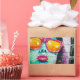 Un tableau cool sur un mur en brique d'une fille en lunettes de soleil rose et jaune chaud avec rouge à lèvres rose chaud. Elle est faite en bleu turquoise clair et vert menthe.