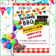 Cette invitation au barbecue jardin exige de l'attention avec son design à damiers rouge et blanc audacieux. L'ambiance festive est renforcée par des ballons colorés, un barbecue grill et une cuisine alléchante.
