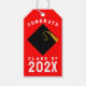 Klassische Abschluss Gratulationen Geschenke Tags für grad Gastgeschenke mit schwarzen Mütze mit Gold Tassel auf rotem Hintergrund. Text bearbeiten, um Jahr hinzuzufügen.