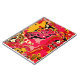 Vibrant, abstract shapes create a lively pattern filled with reds, pinks, yellows, and blacks, resembling a mosaic or stained glass effect. The overlapping forms give a sense of movement and complexity, inviting the eye to explore the intricate details.