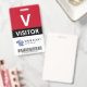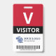 Vertikales Abzeichen mit einem großen V vor weißem Hintergrund. Der Besucher unter sich in klaren Buchstaben. Fügen Sie Ihr Logo und Ihren Bar-Code hinzu. Besucher Abzeichen personalisiert mit Logo und Strichcode in minimalistischem Design in Rot, Weiß und Schwarz.