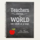 Custom teacher planner with red apple and inspirational white typography script quote "Teachers change the world one child at a time" on a chalkboard background. Personalize with your teacher's name and text!