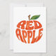 Das Design enthält die Wörter "Red Apple", kreativ in Form eines Apfels mit einem grünen Blatt oben angeordnet. Die Typografie ist kühn und farbenfroh und vermittelt einen fröhlichen und lebendigen Eindruck.
