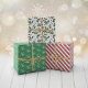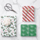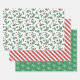 Rote, grüne und weiße Weihnachtsblätter mit Mustern in passenden Farben: eine mit grünen Zweigen voller roter Beeren. Eine mit roten und weißen Pfefferminzstreifen. Und einer in Grün mit weißer Linie Kunst der Beerenzweige.