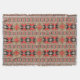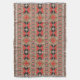 Diese Decke weist ein sich wiederholendes rot-schwarzes Strick auf einem bräunlichen Hintergrund auf.