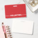 Red Blank Volunteer Name Tagmit Titel in weiß fett Sans Serif Schriftart mit Leerzeichen für Ihren Namen auf rotem Hintergrund.