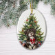 An der Vorderseite dieses Holiday-Ornaments befindet sich das Bild eines kleinen Havaneshundes, der einen festlichen roten Bogen trägt. Der Hund sitzt vor einem verzierten Holiday-Baum. Auf der Rückseite steht rot und grün "MERRY CHRISTMAS", und es gibt zusätzliche Textfelder, die Sie anpassen können. Lass es sagen, was du willst!