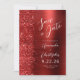 This elegant modern wedding save the date card features a red brushed metal background decorated with faux diamond glitter. The customizable text combines white script and sans serif fonts. The reverse side repeats the red brushed metal and glitter design.